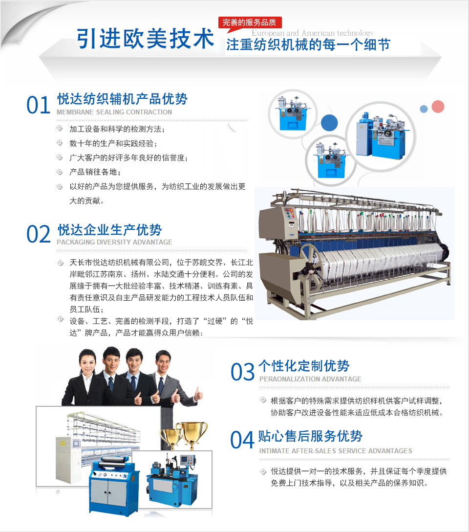 天長市悅達紡織機械有限公司座落在皖東天長市仁和集鎮人民西路88號,公司位于蘇皖交界、長江北岸毗鄰江蘇南京、揚州、水陸交通十分便利。 公司是主要生產紡織平車安裝工具、紡部輔件及配件綜合性企業。已有二十多年的生產歷史,在激烈的市場競爭中始終保持優(yōu)良的質量、優(yōu)化的價格、齊全的品種優(yōu)勢。產品暢銷全國各地,深受新老客戶的好評。 公司以服務客戶滿足用戶為己任,不斷提高產品加工精度,拓展系列品種,以高標準、高起點滿足客戶需求。公司精神:創(chuàng)新、開拓、務實。公司宗旨:追求誠信、追求質量、追求服務、為用戶著想。